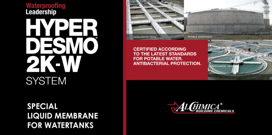 Alchimica’nın su depoları ve rezervuarları için geliştirdiği iki komponentli HYPERDESMO®-2K-W ürünüyle uygulanan su yalıtım sistemi, bu kapsamda yüksek standartlarda performans sergilemektedir. Aşınmaya, kimyasallara ve yaş/kuru döngüsüne karşı alt yapıyı en üst düzeyde korumaktadır ve sertifikası içme suyu tanklarında kullanılmak üzere tescil edilmiştir. Hidrofobik özelliği ve hidroliz direnci çok yüksektir. Uzun servis ömrünün yanı sıra solventsiz